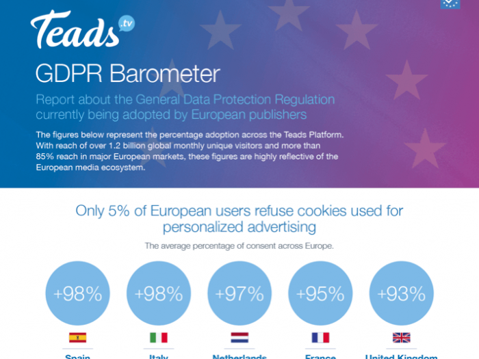Solo il 5% degli utenti di Internet di tutta Europa dice no all’utilizzo dei cookie per ricevere pubblicità personalizzate. E’ quanto è emerso dal nuovo report settimanale di Teads, creato per raccontare lo stato di allineamento dei publisher europei alle nuove direttive del General Data Protection Regulation (GDPR). Un barometro che fa riferimento agli editori